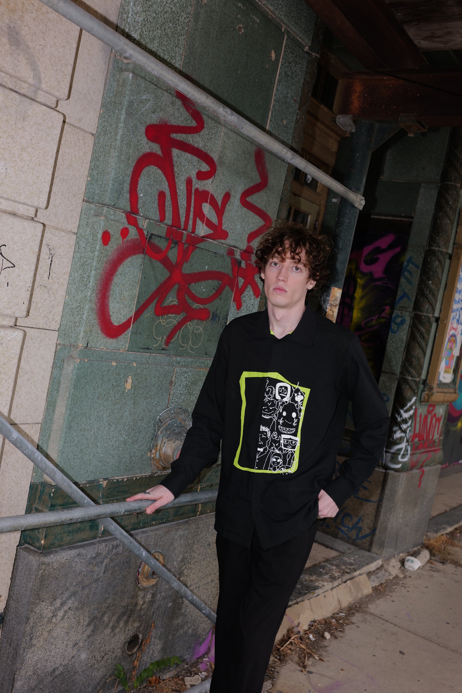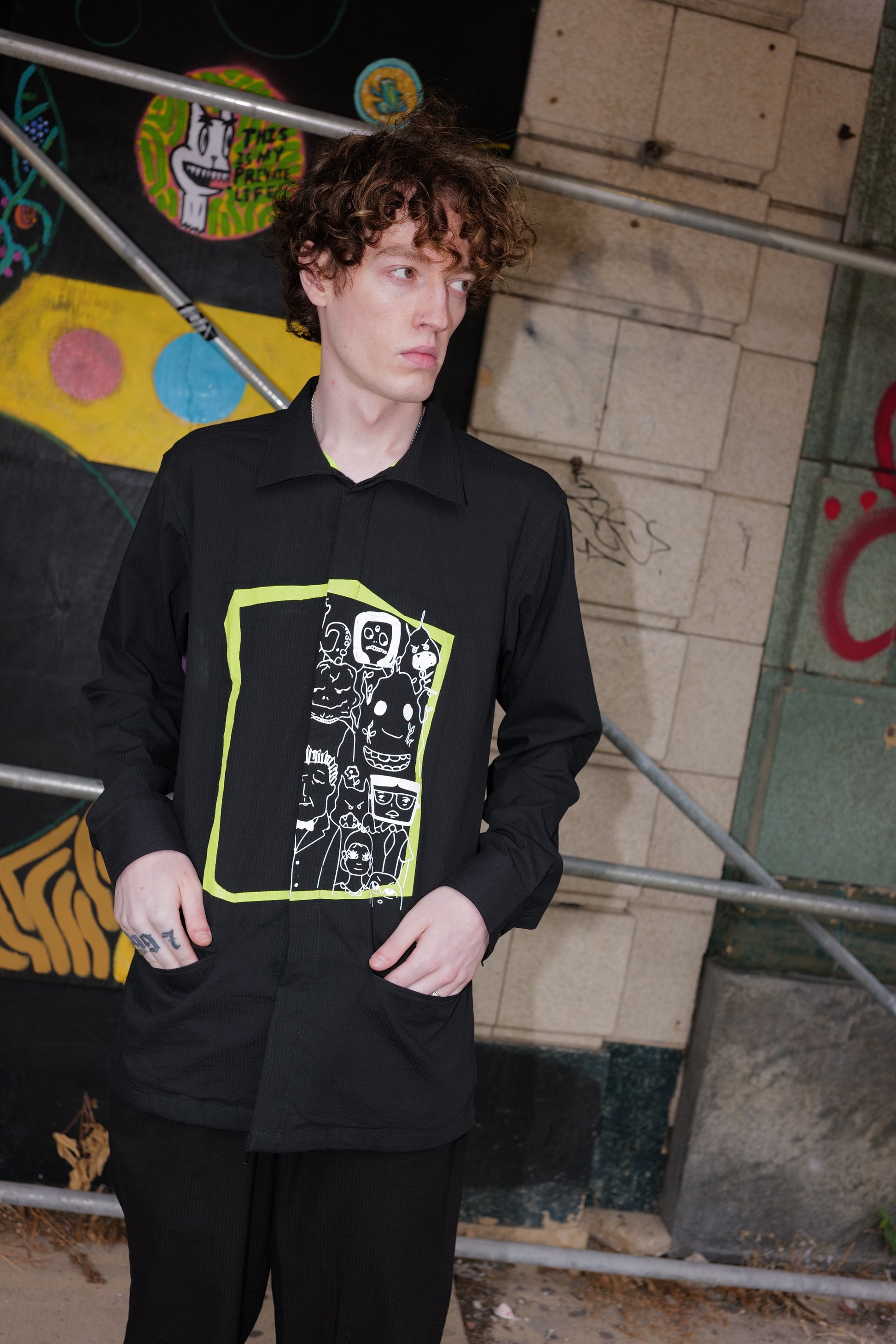 Relaxed fit black seersucker button down shirt jacket with screen printed artwork.