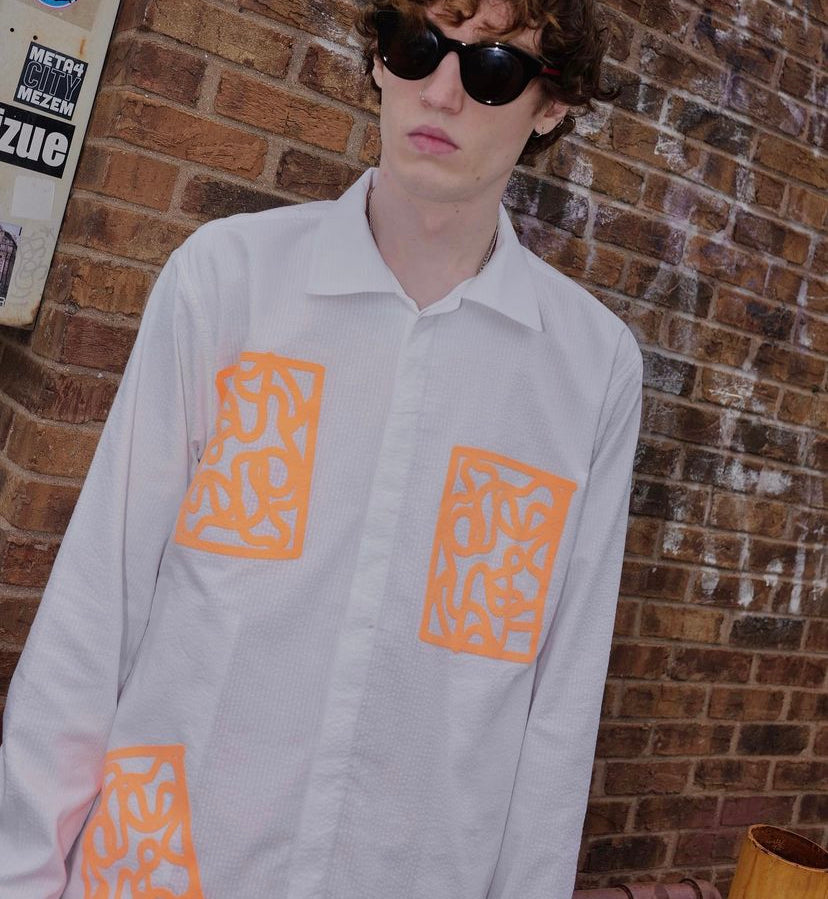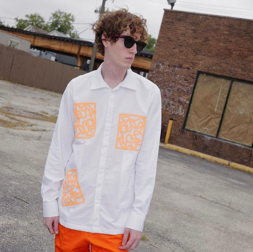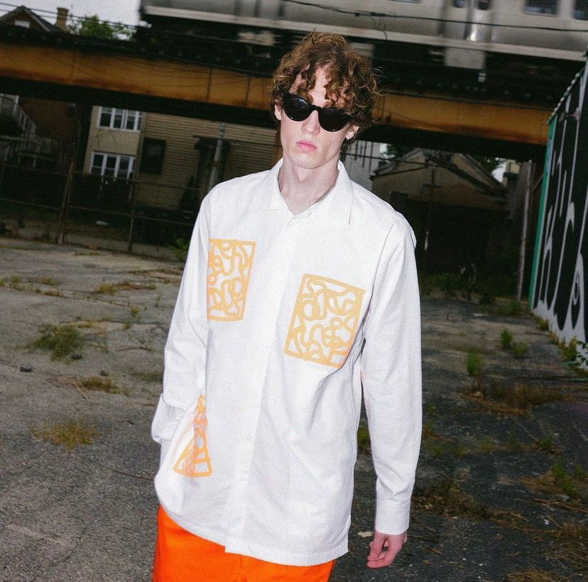 Relaxed fit white seersucker button down shirt jacket with screen printed artwork.