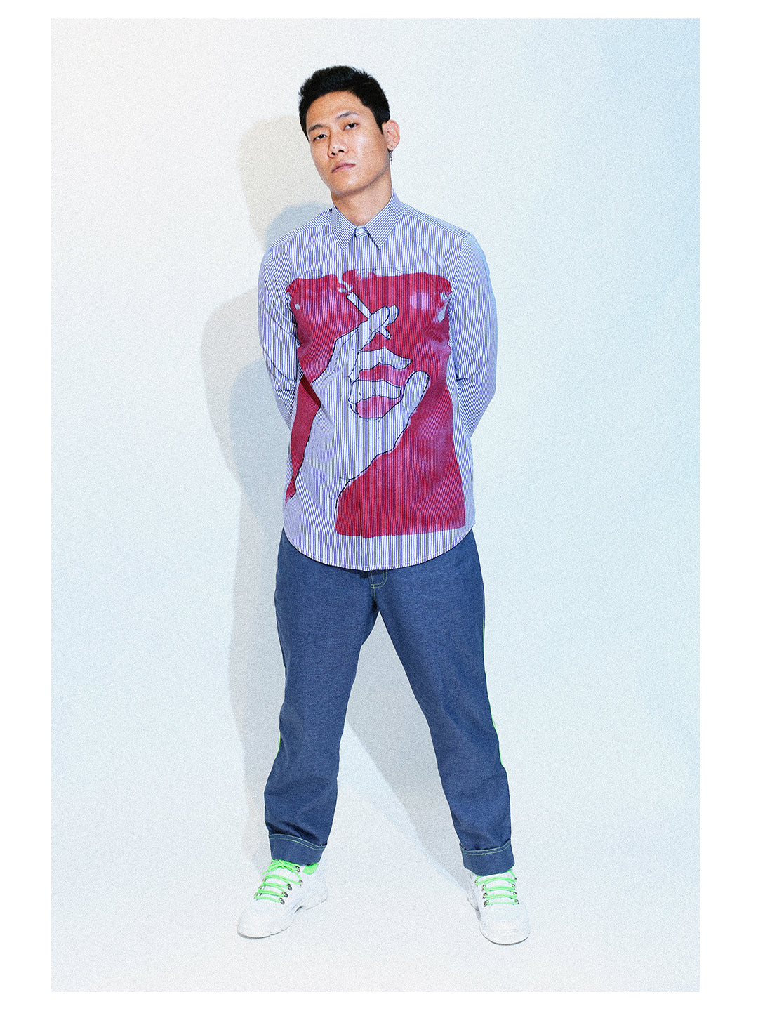 Screen printed artwork on a stripe shirt.